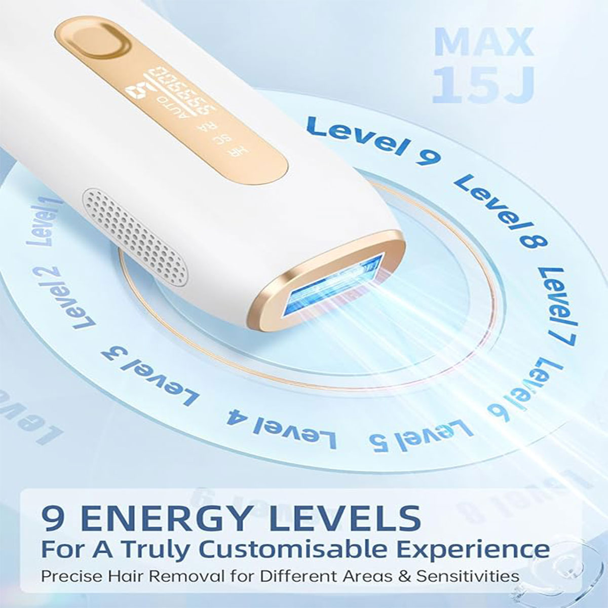 9 سطح انرژی قابل تنظیم: امکان تنظیم شدت نور متناسب با رنگ پوست و مو، برای حداکثر اثربخشی و ایمنی.